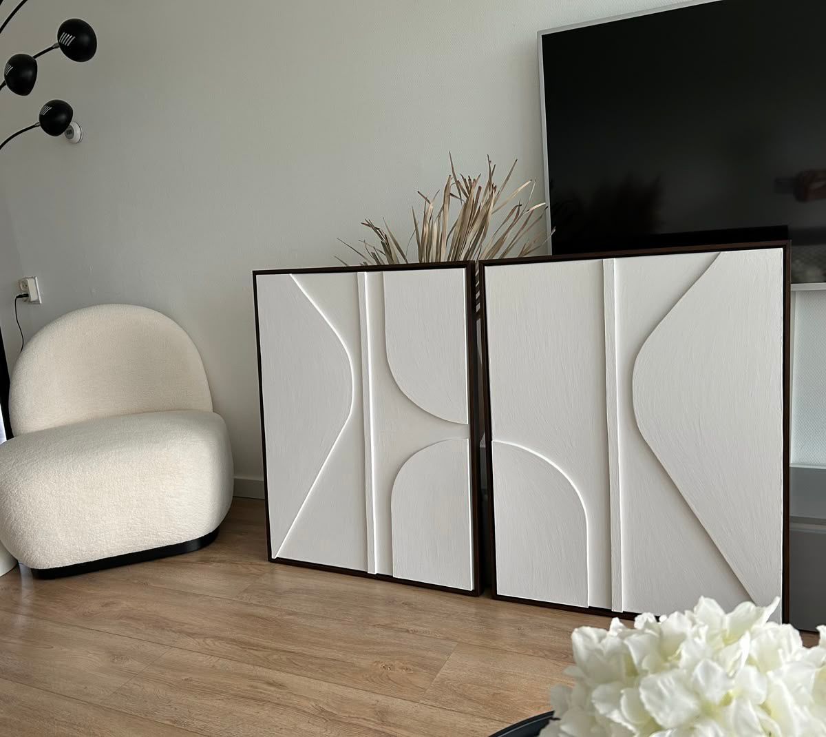 De 3D-kunstwerken van Abstracta zijn met de hand gemaakt, duurzaam en eenvoudig van ontwerp. Ze worden vervaardigd van gerecycled hout en afgewerkt met natuurlijke verf. Elk kunstwerk krijgt een op maat gemaakte lijst, waardoor ieder stuk uniek is.